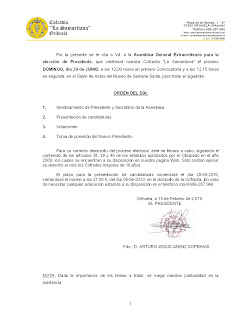 Adjuntamos la convocatoria enviada a los Cofrades, con la citación para la Asamblea General Ordinaria, que se va a celebrar el domingo 20 de Junio, con motivo de las elecciones a la Presidencia de Nuestra Cofradía. En la misma encontrareis las normas que se van a seguir para garantizar la fluidez de las mismas, segun estracto de los Estatutos en vigor.