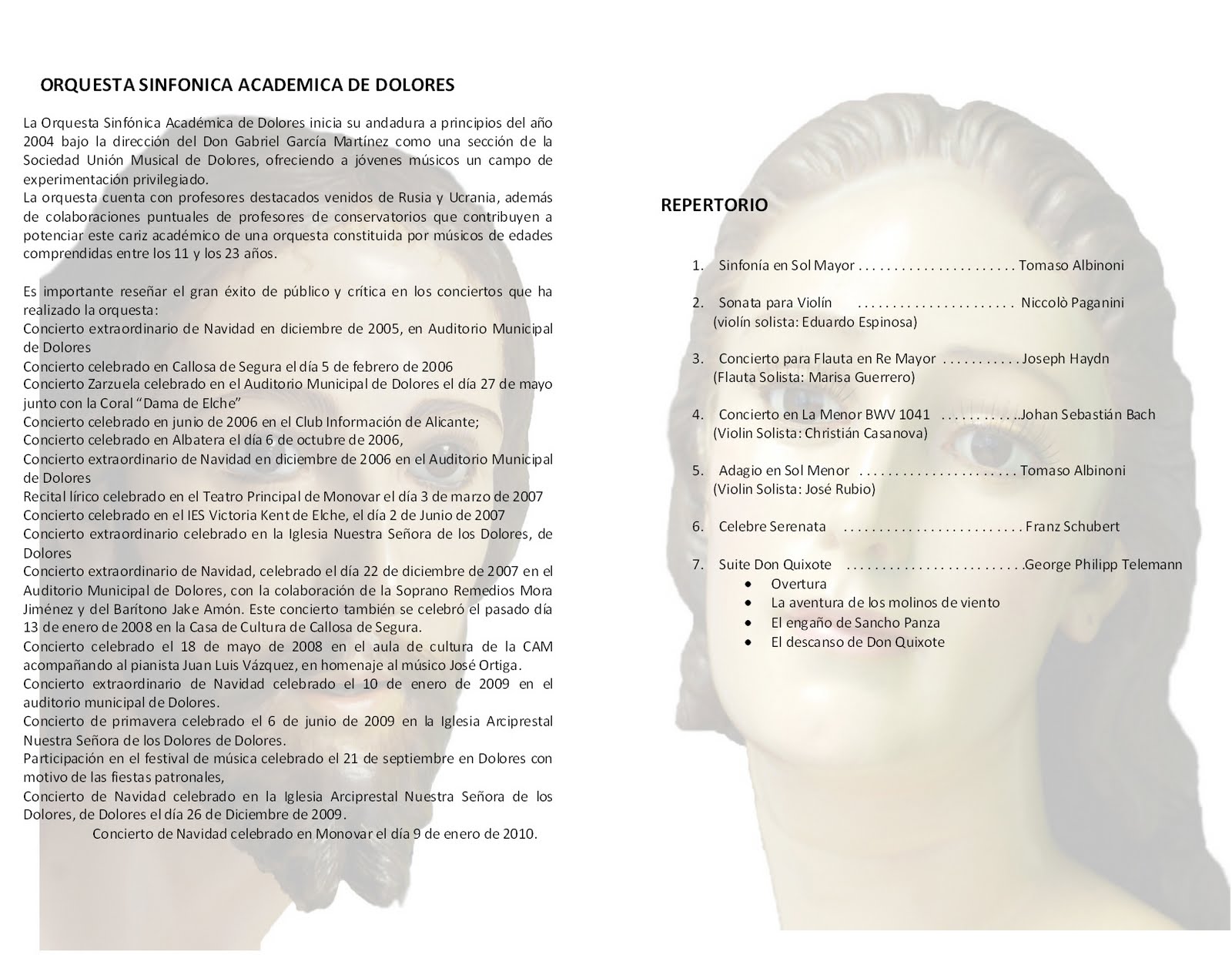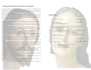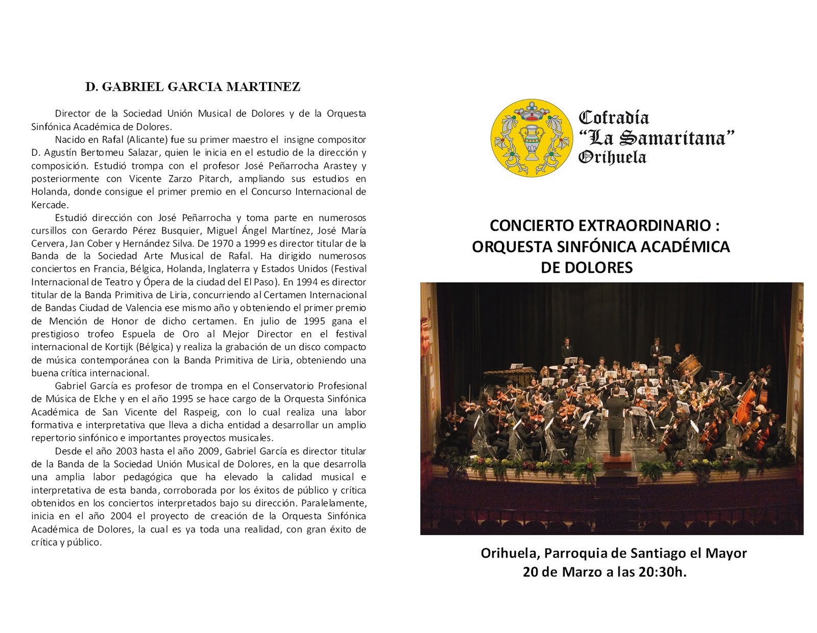 Con motivo de la Restauración de la Imagenes de La Samaritana y Nuestro Señor, va a tener lugar un concierto extraordinario a cargo de la Orquesta Sinfonica Academica de Dolores en la Iglesia de Santiago el día 20 de Marzo, del cual adjuntamos programa.
