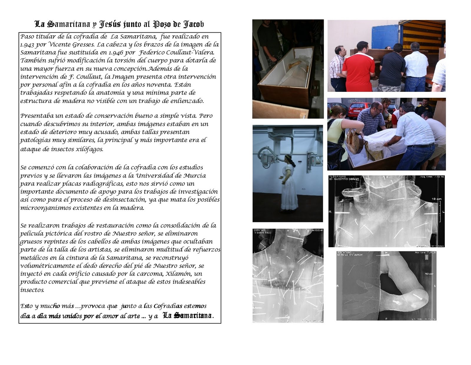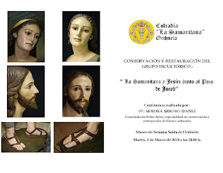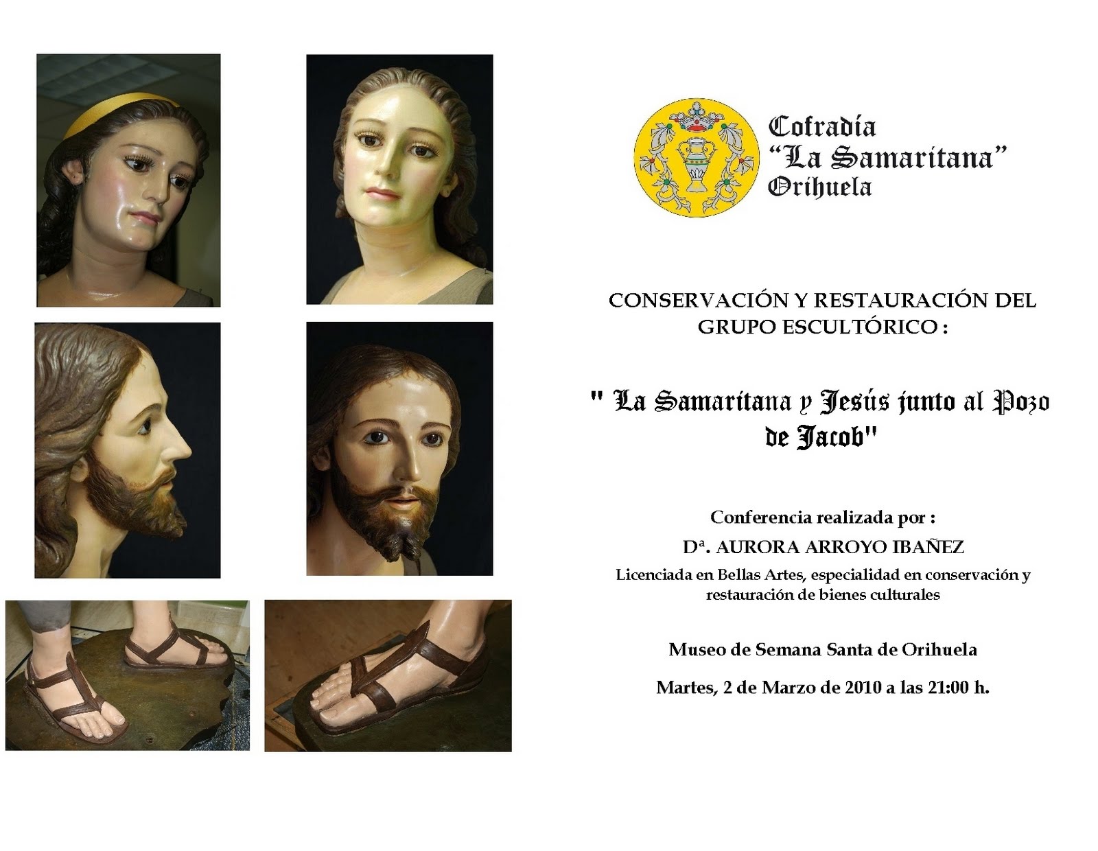 Queda adjunto el programa de mano que hemos distribuido para la conferencia que va a dar, la restauradora de las Imagenes de Nuestro Trono Titular, Dª Aurora Arroyo Ibañez, la cual va a ser muy grafica, ya que se ha basado en las fotografias y radiografias de la evolución de dicha restauración.