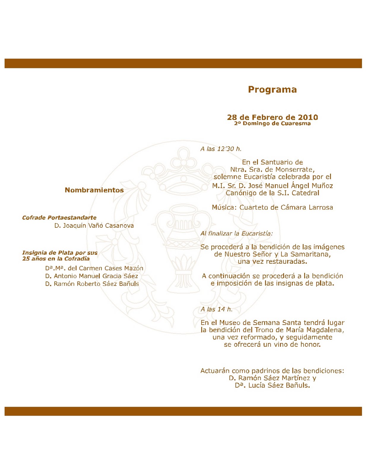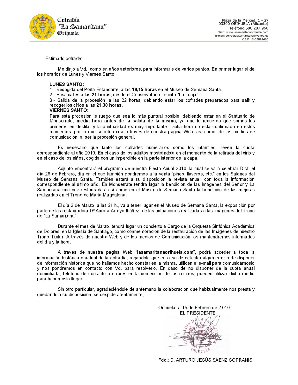 Incluimos tanto el programa de actos para la Fiesta Anual 2010, a celebrar el 28 de Febrero, como el escrito que hemos remitido a todos los Cofrades, sobre la preparación de la proxima Semana Santa.